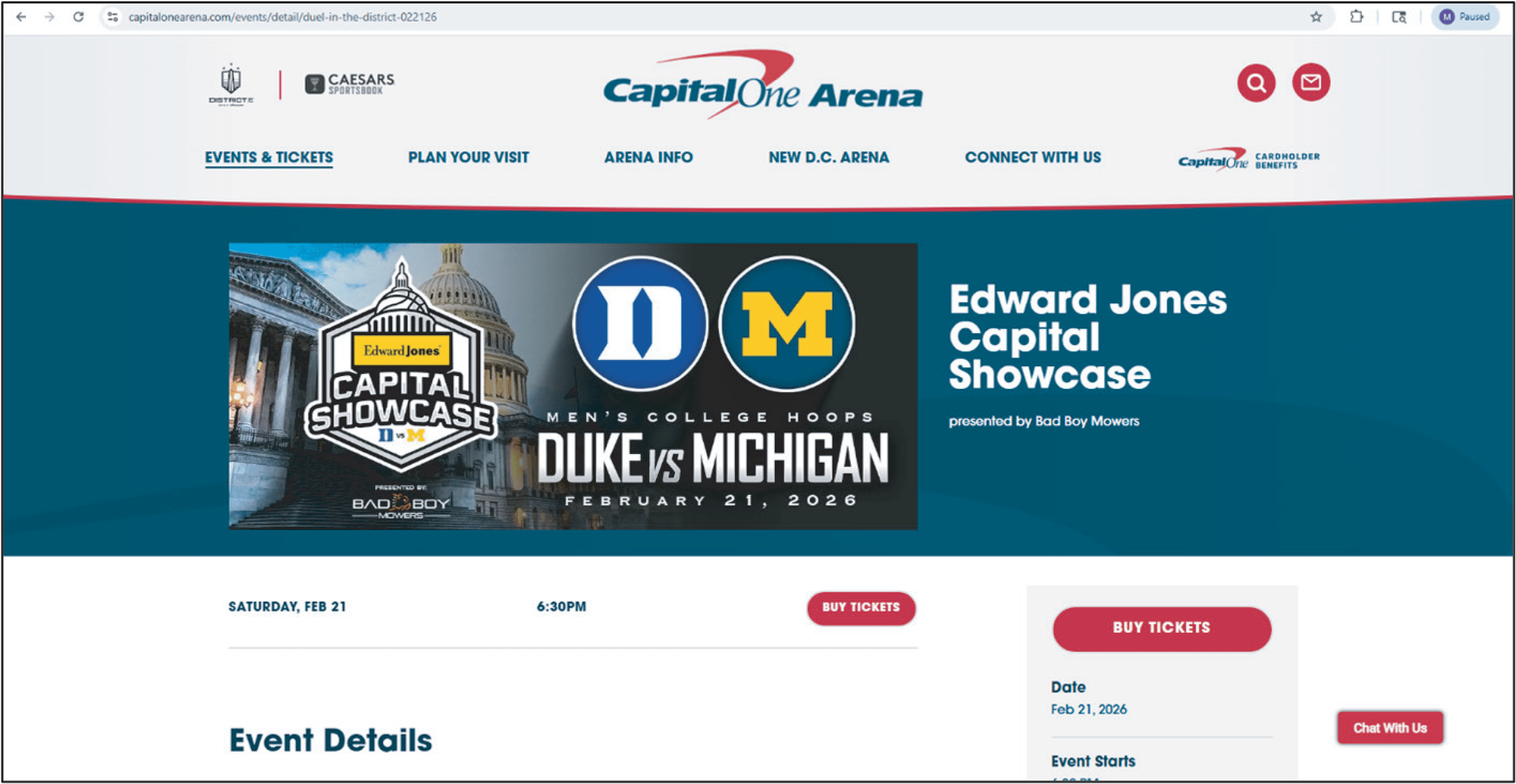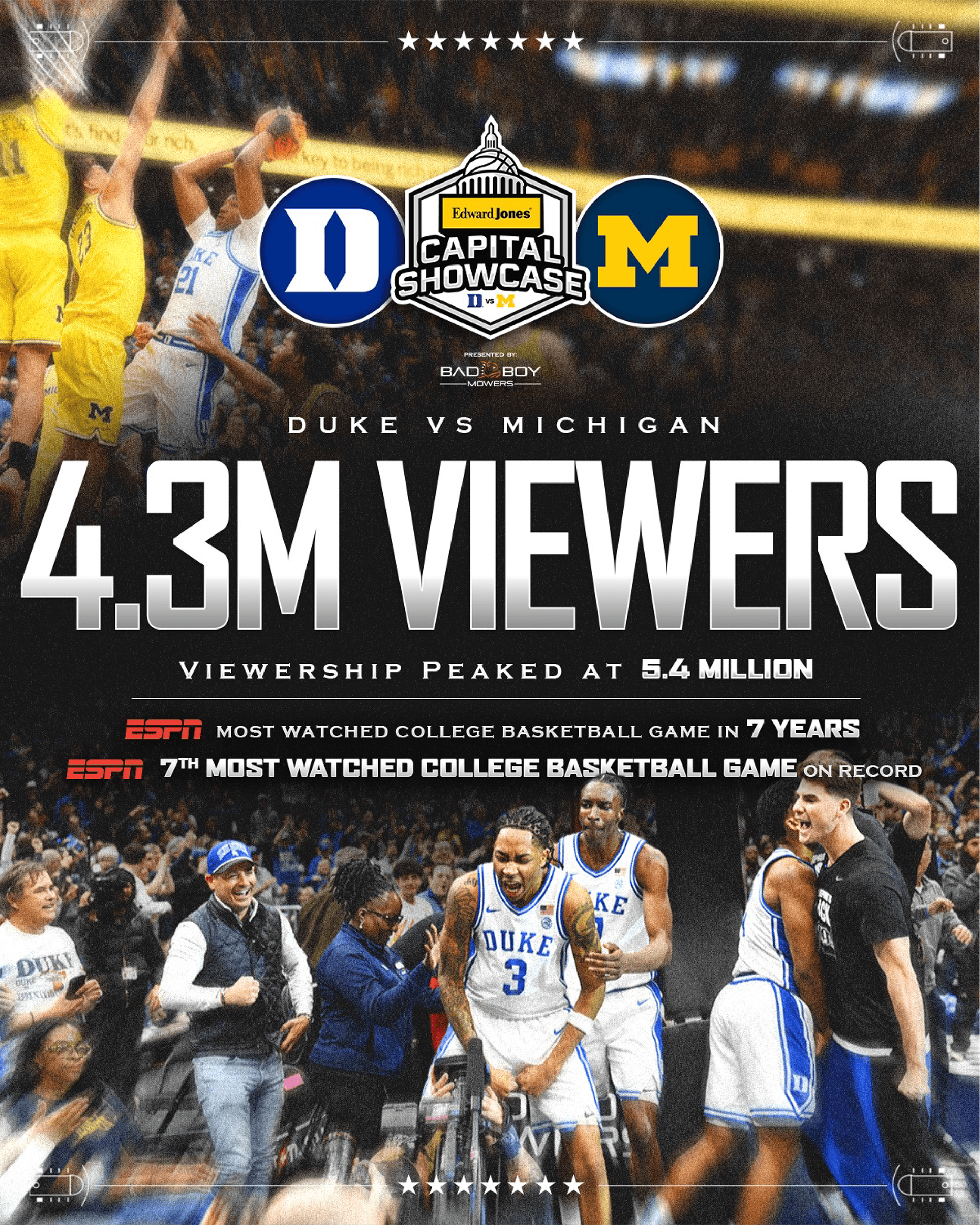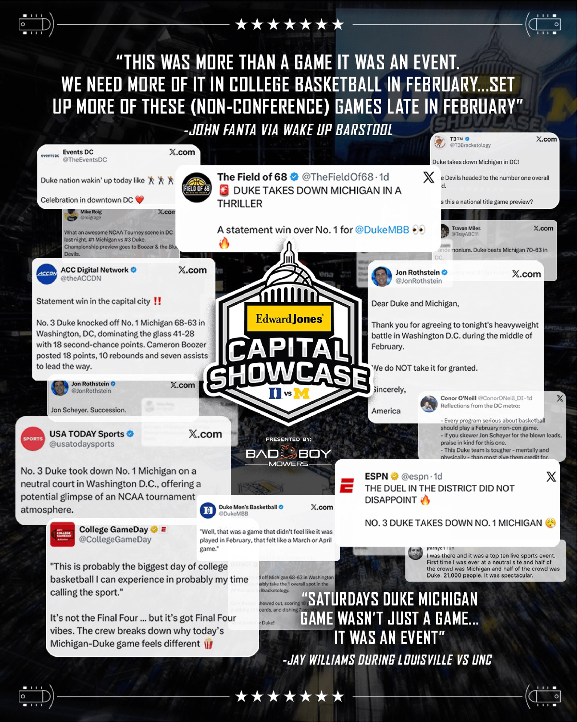 The Edward Jones Capital Showcase was a single game matchup between #1 Michigan and #3 Duke in Washington D.C. at Capital One Arena. The goals for this project were to create a truly memorable and immersive experience for the teams, fans, and media alike. Creating the visual look for this event was an incredible experience. Starting with designing the logo in collaboration with Edward Jones for the “Edward Jones Capital Showcase” to animating dynamic court projections and full venue signage for the event as well for both Duke and Michigan open practices in a first of its kind ESPN College Gameday experience, to transforming locker rooms and tunnels, to creating a webpage and designing cohesive social media assets that built hype for weeks.