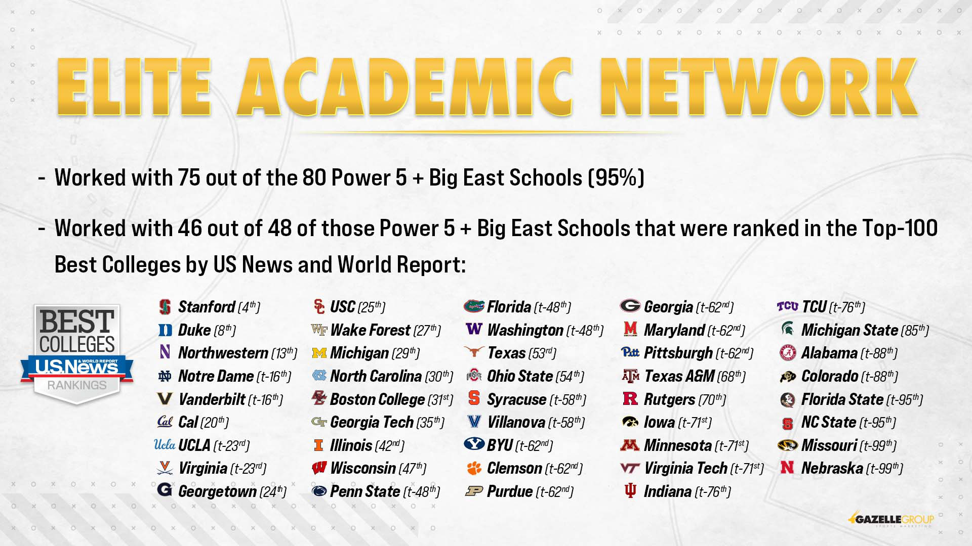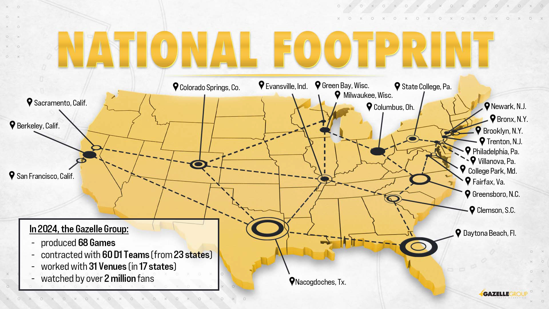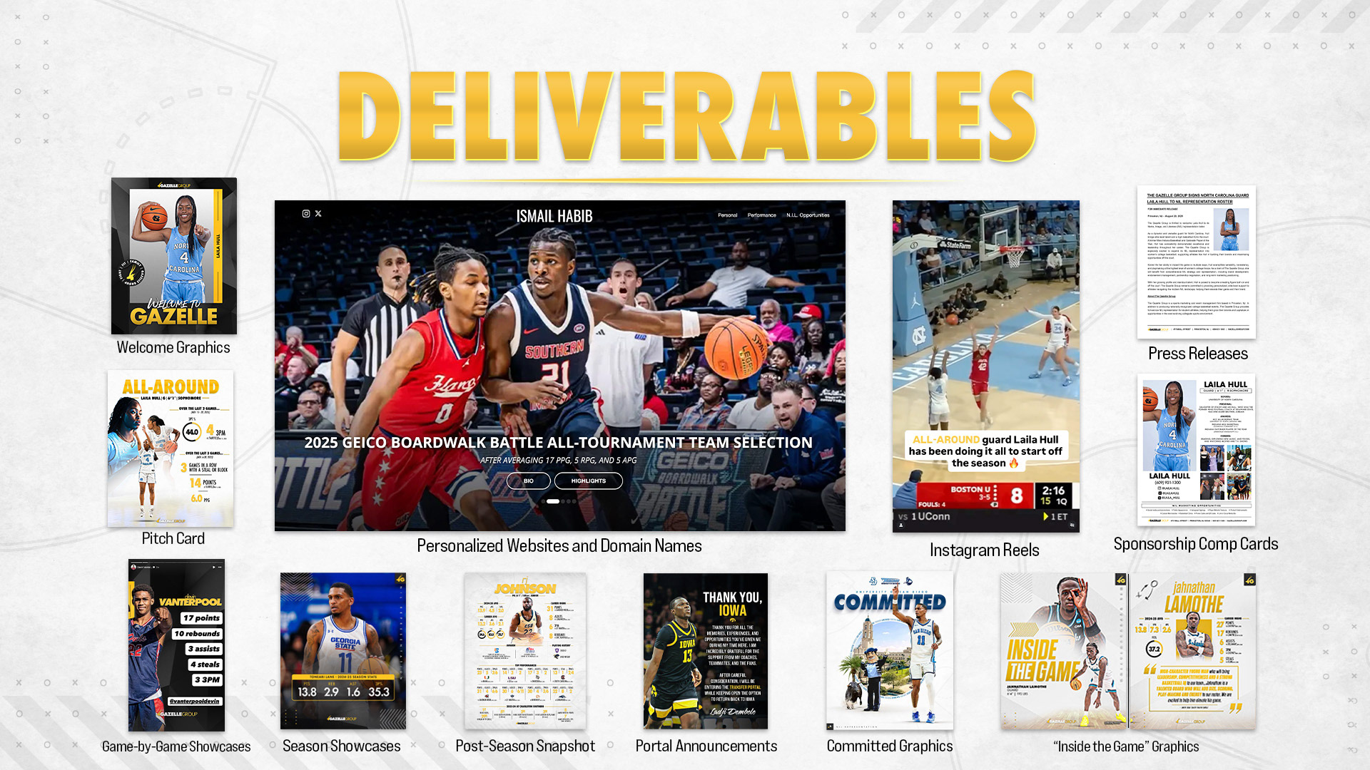 I helped launch the Gazelle Group NIL Representation Division in 2024 by creating branding for the new division as well as a wide range of multimedia and deliverables for our clients such as: websites - both for Gazelle and Individualized Player websites for each of its growing client list, social media graphics and templates, Sponsorship/Marketing/Sales Presentations and Material for each of our clients, Highlight Reels as well as Recruiting Graphics and Presentations.